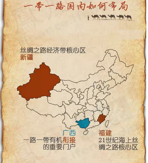 3月28日,國(guó)家發(fā)改委、外交部、商務(wù)部聯(lián)合發(fā)布《推動(dòng)共建絲綢之路經(jīng)濟(jì)帶和21世紀(jì)海上絲綢之路的愿景與行動(dòng)》,劃定了中國(guó)經(jīng)濟(jì)對(duì)外發(fā)展的五條國(guó)際大通道,圈定了沿線18個(gè)省份,并將新疆、福建分別設(shè)定為陸海“兩翼”核心區(qū)。