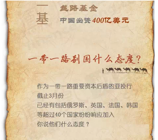 而這并不是商務(wù)部第一次提到“一帶一路”重大項(xiàng)目,早在去年12月就有過(guò)類(lèi)似表述,“商務(wù)部將用好亞洲基礎(chǔ)設(shè)施投資銀行和‘絲路基金’,啟動(dòng)一批重大合作項(xiàng)目,盡快取得早期收獲成果。”