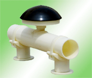 曝氣器采用球冠形結(jié)構(gòu),膜片采用斜穿切口式打孔技術(shù),其中心頂部有無孔區(qū),且內(nèi)設(shè)兩道環(huán)形止水線,因而具有良好的防堵塞、防倒灌性能。