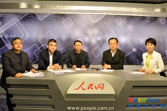 北京市水務(wù)局局長金樹東(左四)、工程建設(shè)與管理處處長伊鋒(左三)、供水管理處處長胡波(左二)、排水管理處處長段偉(左一)做客人民網(wǎng)強(qiáng)國論壇 (黃玉琦 攝)