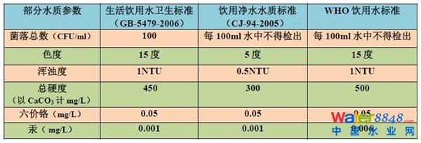 生活飲用水國標、飲用凈水國標以及WHO飲用水標準部分參數(shù)的對比,水質檢測的指標有百來項,以上擇取了標準中存在差異的部分指標。