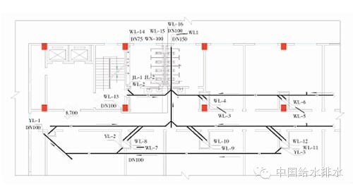 控制好管道井?dāng)?shù)量和間距。管道井?dāng)?shù)量太多會(huì)占用建筑空間,增加工程造價(jià),數(shù)量太少會(huì)增加橫干管的管徑和數(shù)量,造成給排水橫干管連接復(fù)雜,各專業(yè)管線交叉多,不利于施工與維護(hù)。為控制管井?dāng)?shù)量和大小,與建筑物各層相關(guān)程度小的管道可不進(jìn)入管道井,如從屋面消防水箱下來的消防、噴淋管道,一般只與地下室機(jī)房消防管道連通,與中途各層沒有聯(lián)系,可單獨(dú)沿柱、墻角直通地下室。