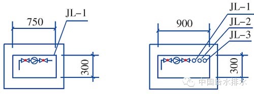確定管道井尺寸首先應(yīng)確定管道的數(shù)量,這取決于給排水的系統(tǒng)組成和分區(qū)數(shù)量。其次應(yīng)進(jìn)行管道排列,使管道盡量靠墻、柱、墻內(nèi)側(cè)布置,盡可能留出較大的維修空間;最后再根據(jù)各管道的管徑,管道間距,考慮保溫層厚度、閥門占據(jù)位置等因素,計(jì)算所需的管道井尺寸(見表1)。管道井可設(shè)計(jì)成多種形狀,以矩形居多。對于矩形管道井,進(jìn)人檢修時(shí),進(jìn)深凈尺寸不宜小于0.6 m,不進(jìn)人檢修時(shí),留有檢查口即可,進(jìn)深凈尺寸不宜小于0.2 m。管道井長度除考慮立管所占空間外,還應(yīng)考慮立管接出的支管所需尺寸,例如水表及前后直線管段(含表前閥門段)最小總長度為0.6 m,則管道井的面寬凈尺寸最小為0.75 m,當(dāng)有三根給水立管并列放置時(shí),水道井面寬凈尺寸不宜小于0.9 m(如圖4所示)。