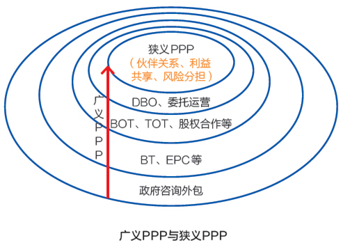 目前國(guó)內(nèi)討論的PPP有狹義和廣義之分。狹義的PPP泛指公共部門(mén)與私營(yíng)部門(mén)為提供公共產(chǎn)品或服務(wù)而建立的各種合作關(guān)系,更加強(qiáng)調(diào)合作過(guò)程中的利益共享及風(fēng)險(xiǎn)分擔(dān)機(jī)制,需要財(cái)政資金參與投資并有清晰的責(zé)任與權(quán)利的約定,能較大程度實(shí)現(xiàn)政府與企業(yè)的風(fēng)險(xiǎn)和利益合理分擔(dān)原則的一種特殊關(guān)系。廣義的PPP是指政府與私營(yíng)組織之間為了合作建設(shè)城市基礎(chǔ)設(shè)施項(xiàng)目,或是為了提供某種公共物品和服務(wù),以特許權(quán)協(xié)議為基礎(chǔ),彼此之間形成一種伙伴式的合作關(guān)系,并通過(guò)簽署合同來(lái)明確雙方的權(quán)利和義務(wù),以確保合作的順利完成,最終使合作各方達(dá)到“多贏”的結(jié)果。廣義的PPP可以理解為一系列項(xiàng)目融資模式的總稱(chēng),既包括帶有融資功能的BOT(建設(shè)—經(jīng)營(yíng)—轉(zhuǎn)讓)、TOT(移交—經(jīng)營(yíng)—轉(zhuǎn)讓)、股權(quán)合作等,也包括不帶有融資功能的DBO(設(shè)計(jì)—建設(shè)—運(yùn)營(yíng))、委托運(yùn)營(yíng)等多種模式。