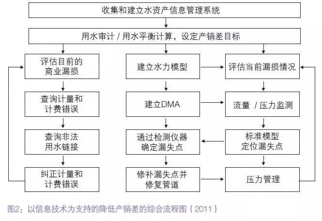 降低產(chǎn)銷差需要先進(jìn)的信息管理、水力模擬和優(yōu)化分析工具,圖表2中所示的流程圖概述了這一過(guò)程。這是一個(gè)指導(dǎo)性或廣義的流程。在實(shí)際應(yīng)用中,并非總是要嚴(yán)格按照?qǐng)D示的步驟進(jìn)行操作,而應(yīng)該因地制宜地應(yīng)用最先進(jìn)的建模方法以及各種檢漏設(shè)備技術(shù)制定有效的產(chǎn)銷查管理策略,制定一套切實(shí)有效的指導(dǎo)流程。