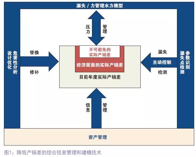 為了有效地提高降低管網(wǎng)漏損的效率和效益,在過(guò)去的幾十年間,隨著針對(duì)供水系統(tǒng)分析的信息技術(shù)(IT)的發(fā)展,系統(tǒng)分析方法,例如水力模擬、基于模型的檢漏技術(shù)和仿真優(yōu)化分析已成功地在實(shí)踐中得到驗(yàn)證。將這些技術(shù)應(yīng)用于降低供水系統(tǒng)的產(chǎn)銷差不僅是可能的,而且是勢(shì)在必的。IT技術(shù)已被成功應(yīng)用于資產(chǎn)管理、水力模型和優(yōu)化模型等關(guān)鍵領(lǐng)域,具體內(nèi)容將于下文詳述。而這些措施在漏損管理的四個(gè)方面取得了良好的績(jī)效,形成一套完整有效的水資源產(chǎn)銷差管理措施(圖表1,2011)。