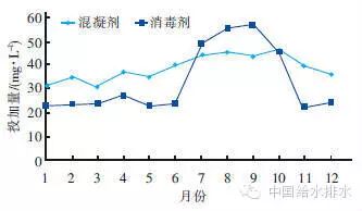 消毒劑大幅增加,直接成本增加明顯。城鎮(zhèn)水廠目前使用的消毒劑為次氯酸鈉液體,常規(guī)投加量為25 mg/L。在藻類暴發(fā)季節(jié),為確保預(yù)氯化效果,減少藻類對(duì)凈水的影響,根據(jù)經(jīng)驗(yàn)確定澄清池出水余氯控制在0.4~0.6 mg/L,從而導(dǎo)致消毒劑投加量增加約45%,達(dá)到35 mg/L。由圖4可知,消毒劑的投加量增加非常明顯。