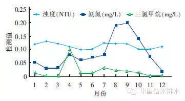 由于藻類的影響,導(dǎo)致了出廠水質(zhì)中濁度、嗅和味、pH值、三氯甲烷、鋁等指標(biāo)的變化,但城鎮(zhèn)水廠通過以上多種措施的應(yīng)用,基本確保了供水水質(zhì)仍維持在優(yōu)良水平。圖22013年城鎮(zhèn)水廠出廠水濁度、氨氮、三氯甲烷檢測(cè)數(shù)據(jù)。