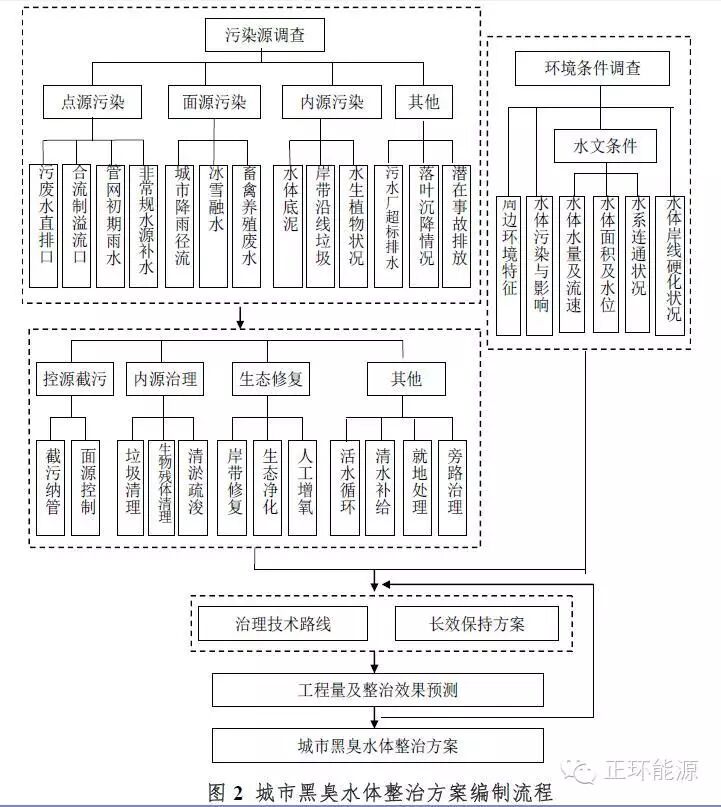 (1)明確目標,整體規(guī)劃?茖W識別黑臭水體及其形成機理與變化特征,結合污染源、水系分布和補水來源等情況,合理制定城市黑臭水體的整治目標、總體方案和具體工作計劃。