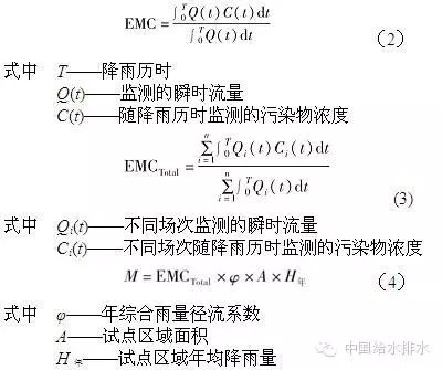 計(jì)算試點(diǎn)區(qū)域和對比區(qū)域的污染物負(fù)荷。根據(jù)降雨徑流水質(zhì)和水量監(jiān)測數(shù)據(jù),單場次降雨徑流的污染物平均濃度EMC可按式(2)計(jì)算,年降雨徑流的污染物平均濃度EMCTotal可按式(3)計(jì)算,試點(diǎn)區(qū)域和對比區(qū)域的年降雨徑流污染負(fù)荷M可按式(4)計(jì)算。