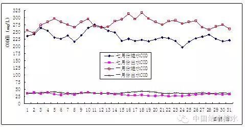 20141月和20147月廢水深度處理工程進、出水COD如圖3所示。