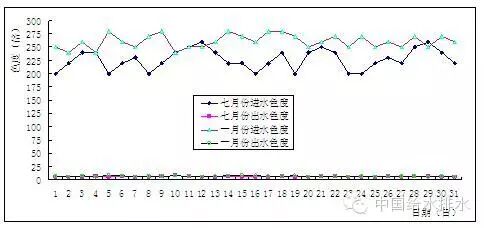 20141月和20147月廢水深度處理工程進、出水色度如圖4所示。