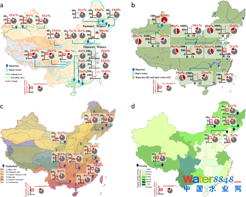 厭氧氨氧化反應(yīng)在我國內(nèi)陸水體的分布及其在不同水體和濕地中的貢獻,包括河流(a)、湖泊(b)、稻田(c)和沼澤(d