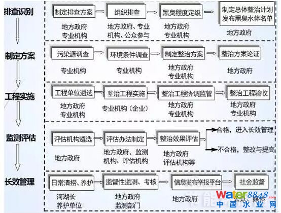 黑臭水體整治工作流程如圖4所示。首先由城市人民政府組織對(duì)轄區(qū)內(nèi)的水體黑臭狀況進(jìn)行逐一排查,并向社會(huì)公布排查結(jié)果,接受公眾評(píng)議。其次,根據(jù)排查和公眾評(píng)議結(jié)果,確定黑臭水體名單和總體整治計(jì)劃(含年度整治計(jì)劃),并建立長(zhǎng)效機(jī)制。第三,根據(jù)黑臭水體總體整治計(jì)劃,委托專業(yè)機(jī)構(gòu)針對(duì)各黑臭水體逐一編制整治方案,按規(guī)定程序開展論證和工程實(shí)施,同時(shí)委托第三方機(jī)構(gòu)按評(píng)估方案全過程跟蹤實(shí)施進(jìn)展,適時(shí)開展公眾評(píng)議,并由地方政府或委托第三方評(píng)估機(jī)構(gòu)組織對(duì)各黑臭水體的整治效果進(jìn)行綜合評(píng)估。最后,地方政府根據(jù)所公布黑臭水體名單、總體整治計(jì)劃及各黑臭水體整治工作進(jìn)展情況,定期(每季度或每半年)公布水體整治效果,并根據(jù)所建立的長(zhǎng)效機(jī)制,開展水體日常維護(hù)與監(jiān)管工作。