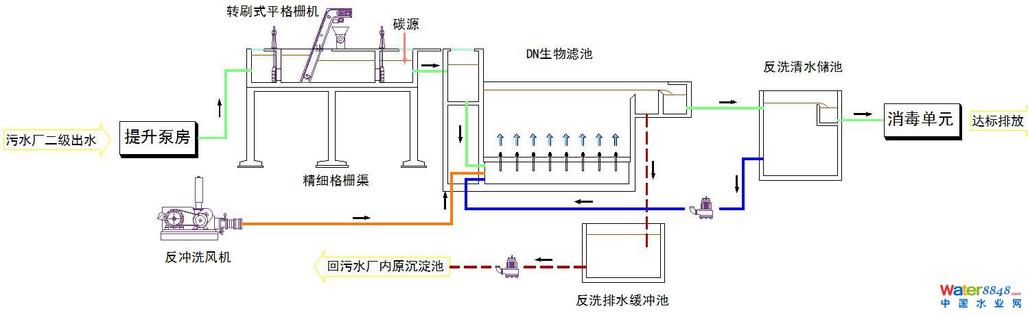 生活污水經(jīng)過提升泵房,進(jìn)入格柵去除粗大漂浮、懸浮物后,采用上向流進(jìn)入深床濾池,利用污水中的硝態(tài)氮進(jìn)行反硝化作用、并消耗降解COD和BOD,若來水碳源不足,需外部投加碳源,出水總氮滿足一級A標(biāo)準(zhǔn)。