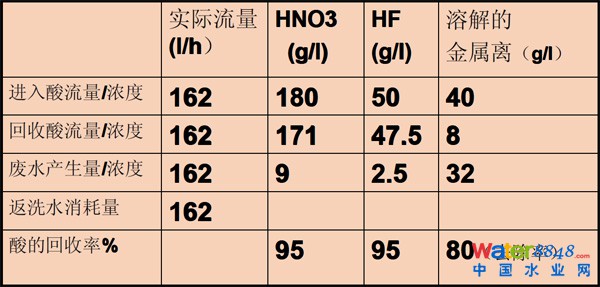使用MiniFlex200型酸回收器處理金屬離子增長率為5.2kg/h的酸洗槽,酸的流量與濃度示例見下表,