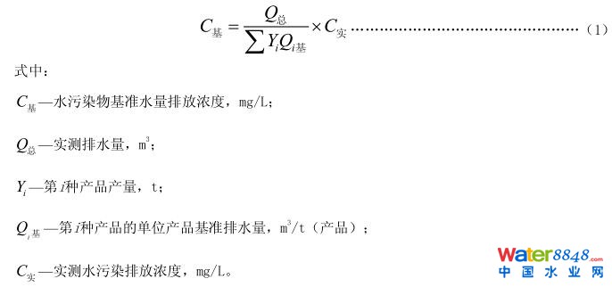 4.3.3若單位產(chǎn)品實(shí)際排水量超過(guò)單位產(chǎn)品基準(zhǔn)排水量,應(yīng)按公式(1)將實(shí)測(cè)水污染物濃度換算為水污染物基準(zhǔn)排水量排放濃度,并以水污染物基準(zhǔn)水量排放濃度作為判定排放是否達(dá)標(biāo)的依據(jù)。產(chǎn)品產(chǎn)量和排水量統(tǒng)計(jì)周期為一個(gè)工作日。
