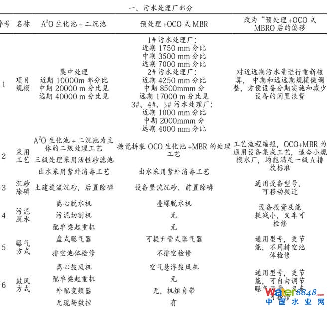 該鎮(zhèn)污水處理項(xiàng)目主體處理工藝分別采用“鎮(zhèn)污水生化池+二沉池”(集中式處理)和“預(yù)處理+OCO式MBRO(分散式處理)的對比見表。