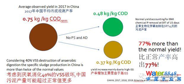 第二,高污泥產(chǎn)量。2017年中國平均污泥產(chǎn)率為每去除一公斤COD產(chǎn)生0.75KG公斤干污泥,意味著比正常值高出77%,考慮到厭氧消化40%的VSS破壞,中國污泥產(chǎn)率可能超過正常值更多。“相當一部分污泥來自進水的無機懸浮固體。”