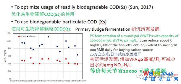 由于碳氮比不夠,外加碳源很普遍。曹業(yè)始指出這個做法的弊端:與此相關(guān)有兩方面問題,第一、實際上進水當中的COD沒有被充分利用;第二,消耗了能源,是不可持續(xù)的。
