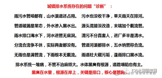 唐建國指出,從上圖可以看出,包括污水系統(tǒng)在內(nèi)的整個(gè)排水系統(tǒng)都“病”了。針對目前存在的問題,唐建國用一段順口溜來總結(jié)對城鎮(zhèn)排水系統(tǒng)存在的問題“診斷”:(如下圖)