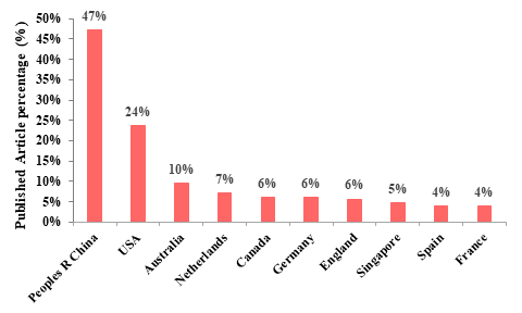 *  web of science統(tǒng)計作者歸屬國并不區(qū)分通訊與非通訊作者,只要論文中有一名中國作者,該論文即可被視為中國作者發(fā)表的論文,中國作者發(fā)表的450篇論文并非都是中國研究者作為通訊作者。