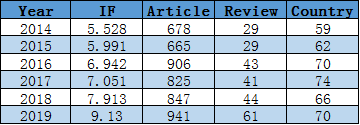 表1. Water Research近5年影響因子、發(fā)表論文數(shù)及來源國家數(shù)