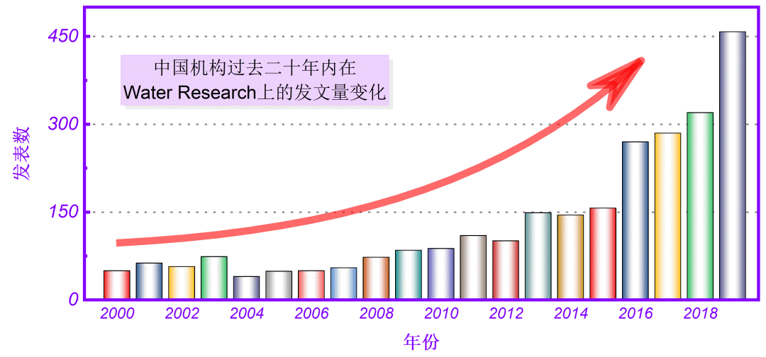 圖1. 中國境內(nèi)過去20年在Water Research雜志上的發(fā)文量變化。
