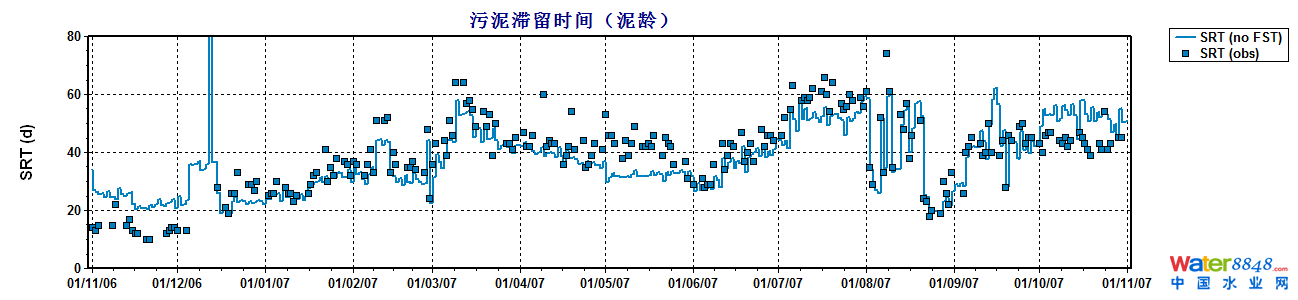 通過對該污水廠過去一年的數(shù)據(jù)的分析和補充實驗數(shù)據(jù)的分析,確定了污水處理廠進水水質(zhì)組分,并調(diào)整參數(shù)對模型進行了校正。校正后的模型可以較好地模擬一年內(nèi)污水廠的運行情況。