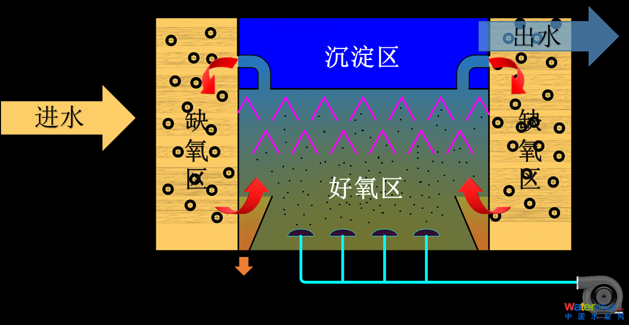 復(fù)合生物法和氧化溝工藝的外圈,在功能上實(shí)現(xiàn)同步硝化反硝化,且通過(guò)精準(zhǔn)智能控制措施,能夠促使污水低速循環(huán),且能防止污泥沉降。