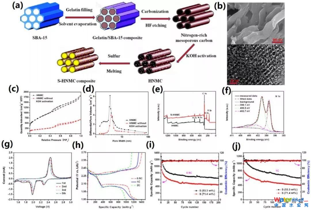 圖13 (a)高度有序的氮摻雜介孔生物碳的合成示意圖;(b)已制得的生物碳基材料的SEM圖和TEM圖;(c-f)生物碳基材料的氮氣吸附脫附曲線,孔徑分布,XPS全譜分析和XPS N1s圖譜;鋰硫電池中生物碳基材料正極材料的電化學(xué)性能:(g)循環(huán)伏安曲線;(h)充放電曲線;(i)0.5C電流密度下的循環(huán)性能;(j)1電流密度下的循環(huán)性能