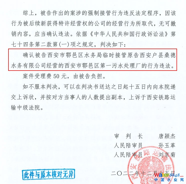 最終,法院判決,確認(rèn)西安市鄂邑區(qū)水務(wù)局臨時(shí)接管戶縣桑德經(jīng)營(yíng)的西安市鄂邑區(qū)第一污水處理廠的行為違法。