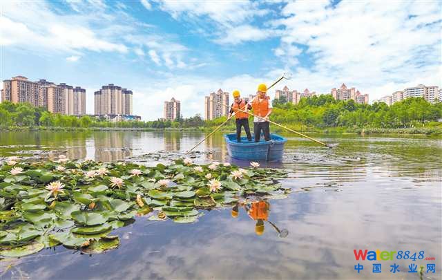 墊江縣牡丹湖濕地公園,藍(lán)天白云倒映在湖面上美如畫,清漂工人在清漂守護(hù)碧水。(攝于2024年5月21日)。通訊員 龔長(zhǎng)浩 攝/視覺(jué)重慶