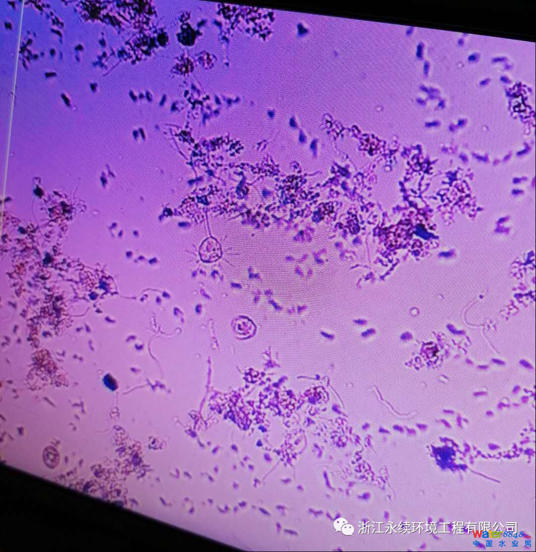 經(jīng)過一段時(shí)間調(diào)試,系統(tǒng)內(nèi)污泥形狀逐漸好轉(zhuǎn),指示性較好地生物逐漸增多,鏡檢發(fā)現(xiàn)較多鐘蟲,少量吸管蟲。見下圖。